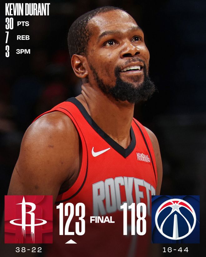 火箭拒絕奇才逆轉后拿到38勝22負跟西部第四的森林狼拉開0.5個勝場;
